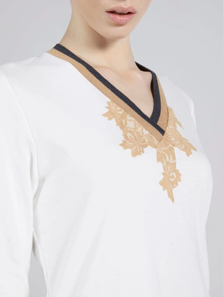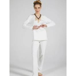 Der Damen Pyjama WKND No. 8 sahneweiß von Verdiani Weekend besteht aus weichem Baumwolle Jersey (100% Baumwolle). Er ist Made in Italy und in den Größen 36 bis 44 erhältlich. Dieser bezaubernde Pyjama hat lange Ärmel und eine Hose mit Gummibund. Das Oberteil ist ca. 65 cm lang und der V- Ausschnitt ist mit einer mehrfarbigen Borte und Blütenspitze (100% Polyamid) gestaltet.