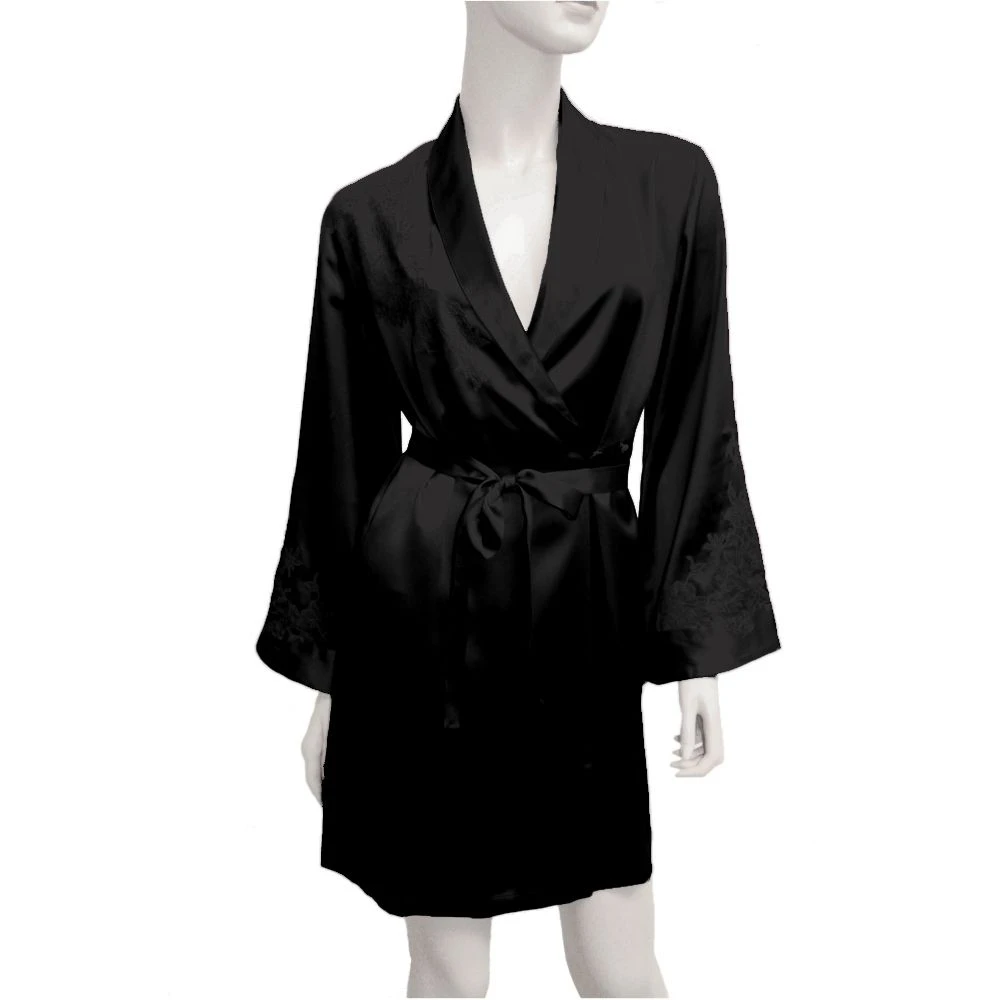 Ein kurzer Morgenmantel der Luxusklasse ist der Seidenkimono Baccarat der französischen Edel-Marke Marjolaine. Der edle Seidensatin wurde mit exquisiter Spitze zu einer aufregenden Nachtwäsche verarbeitet.