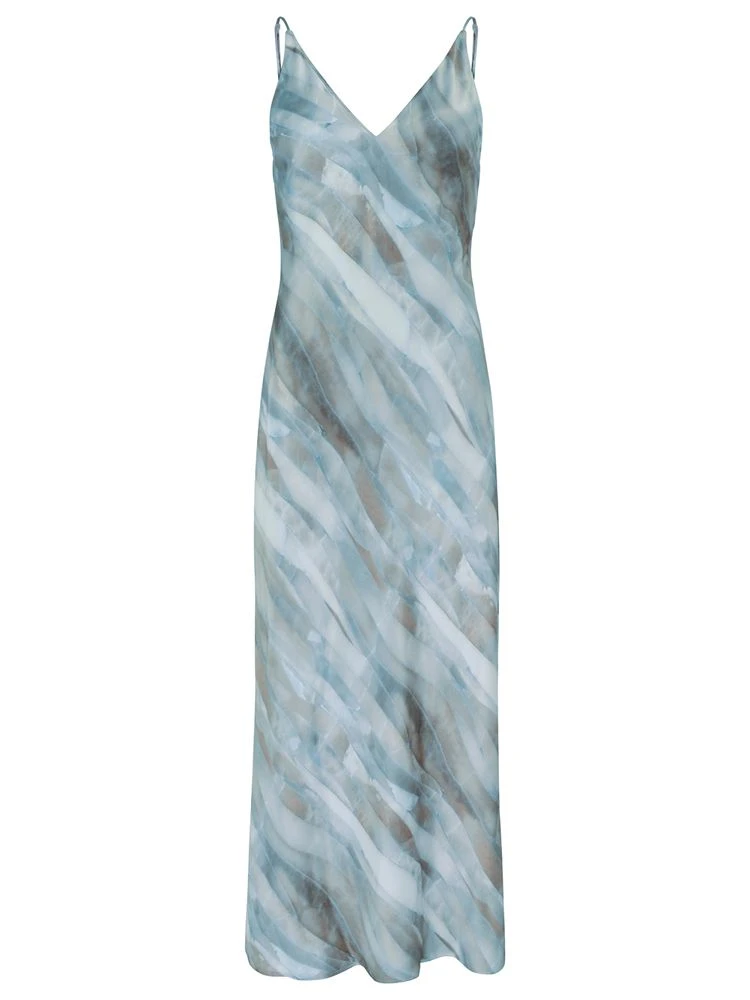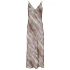 Der Stoff ist einem blauen oder altrosa Muster bedruckt. Dieses Seidennachthemd ist in den Größen S bis L erhältlich. Der Hersteller empfiehlt für diese Kollektion chemische Reinigung.