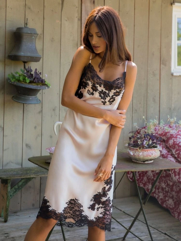 Die französische Caudry Spitze aus Calais hat einen hohen Anteil natürlicher Baumwolle (76% Baumwolle, 24% Nylon) und wurde am Decolleté und am Saum umlaufend in den Seidensatin eingearbeitet. Das Nachthemd ist an der Büste komplett aus Spitze gearbeitet und daher teiltransparent.