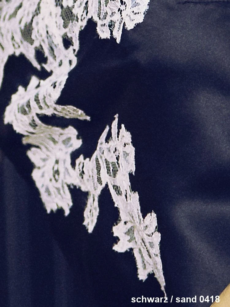 Ein Seidentop der Luxusklasse ist das Spaghettiträger-Top Flavia der französischen Edel-Marke Marjolaine. Der edle Seidensatin aus 100% Seide wurde mit exquisiter Calais Caudry Spitze zu einer aufregenden Seidenwäsche verarbeitet. Diese Spitze hat einen hohen Baumwollanteil von 76% Baumwolle mit 24% Nylon.