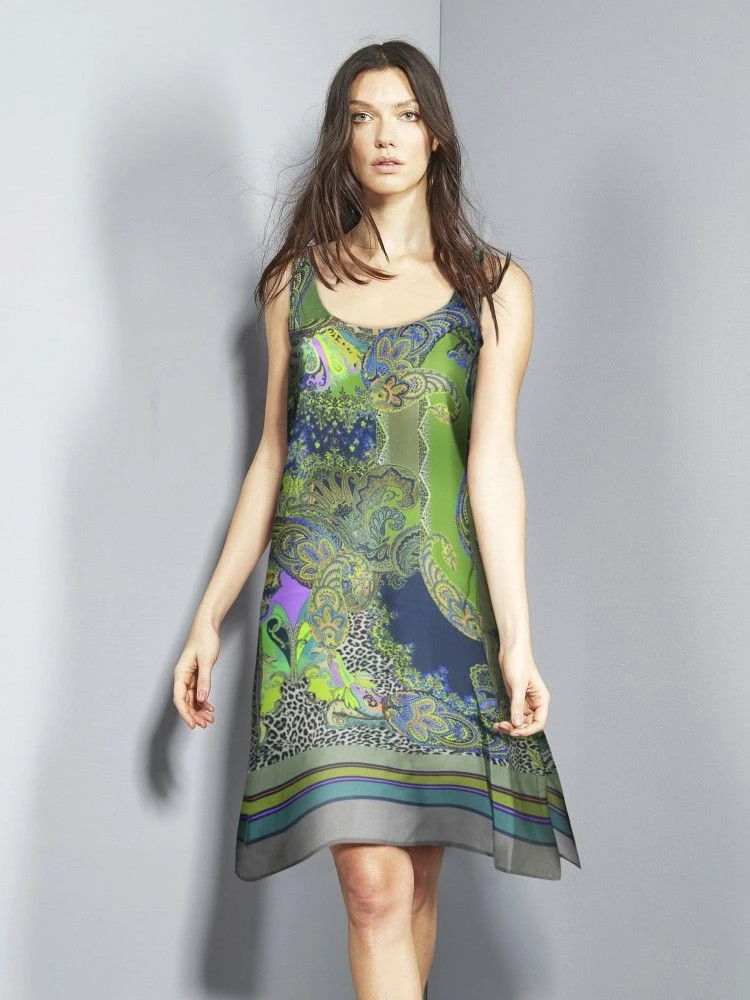 Das Seidenkleid Milano Grün kann als Nachtwäsche getragen werden, als Sommerkleid oder wird in Kombination mit Bademode zu einem schicken Kleidungsstück für den Urlaub. Das platzierte Paisley Muster mit Animal Print Anklängen hat die Farben smaragd, nachtblau, und lila, kombiniert mit gold. Dieses Nachthemd ist ungefähr 100 cm lang.