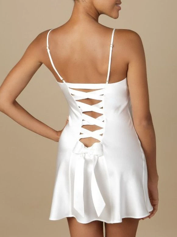 Das Highlight dieses ansonsten schlichten Nachthemdes ist die raffinierte Rückengestaltung mit überkreuzten, geflochtenen Bändern und einer großen Schleife.