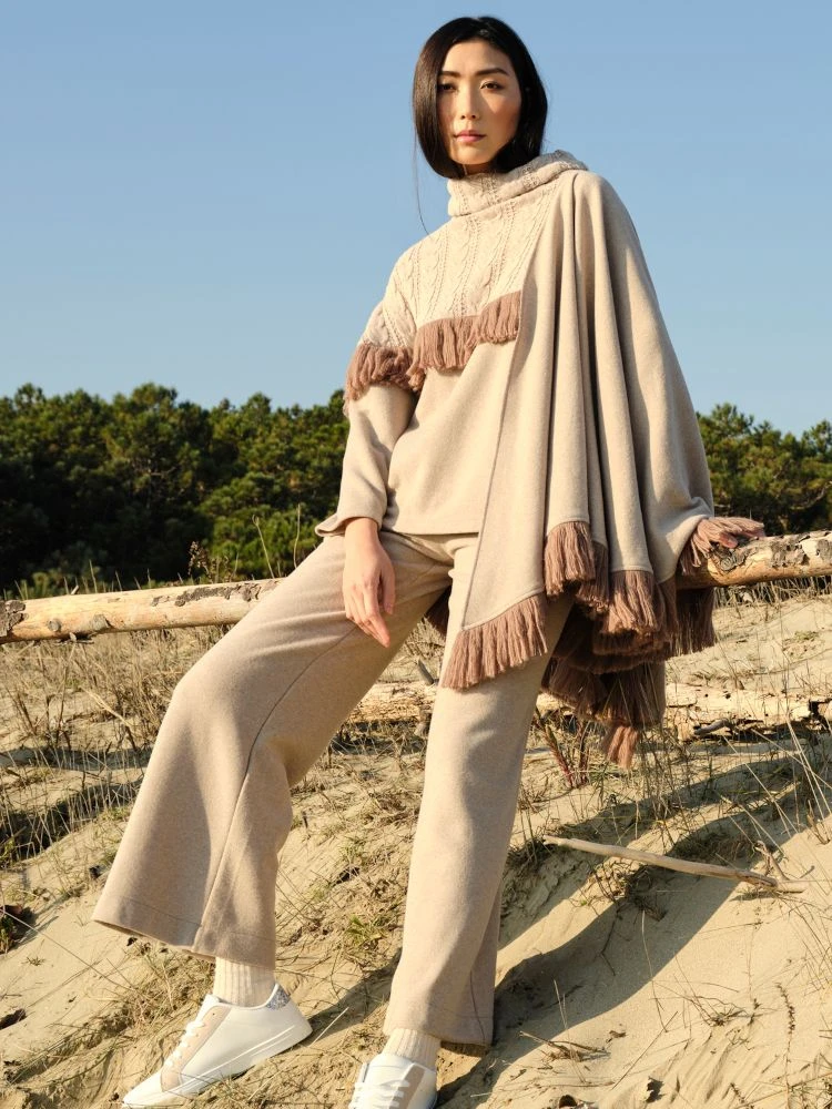 Das Loungewear-Set mit langen Ärmeln und Beinen ist in einem warmen Sandton erhältlich. Das Oberteil ist ca. 60 cm lang und hat lange Ärmel. Die Besonderheit an diesem Lounge Set liegt in dem angenähten Rollkragen Strickcape mit Fransen, welches sich optisch übe die Schultern legt. Durch dieses Detail erhält der schlichte Zweiteiler eine aufregende Note. Die Hose besitzt einen angenehm elastischen Gummizug. Dieser schöne Hausanzug ist optimal für die Übergangszeit so wie den Winter und kann aufgrund der Kuschelbaumwolle ideal als Homewear oder auch als bequeme Reise- und Freizeitbekleidung getragen werden.