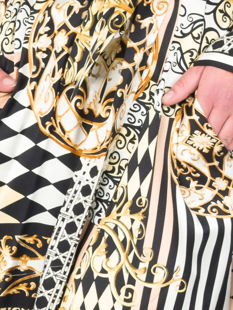 Der Seiden- Kimono mit langen Ärmeln und Bindegürtel ist ein kurzer Morgenmantel von Eva B. Bitzer mit ausdrucksstarkem, goldenen Druck auf schwarzem Hintergrund. Der Kimonomantel aus hochwertigem, bedrucktem Satin besteht aus reiner Seide und ist bequem geschnitten.