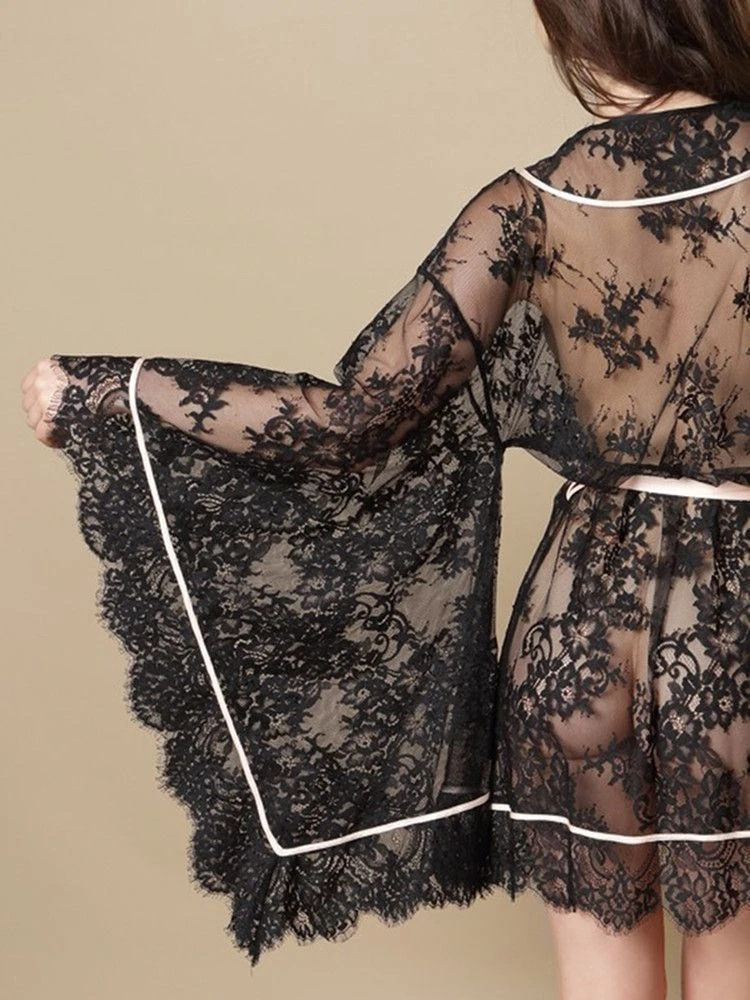 Der kurze Kimono besteht komplett aus floraler, transparenter Spitze. Außerdem hat er abgenähte Biesen aus Seidensatin im Soutache Stil. Dieser kurze Spitzen-Morgenmantel hat extra weite Ärmel und wird mit einem Bindegürtel geschlossen.