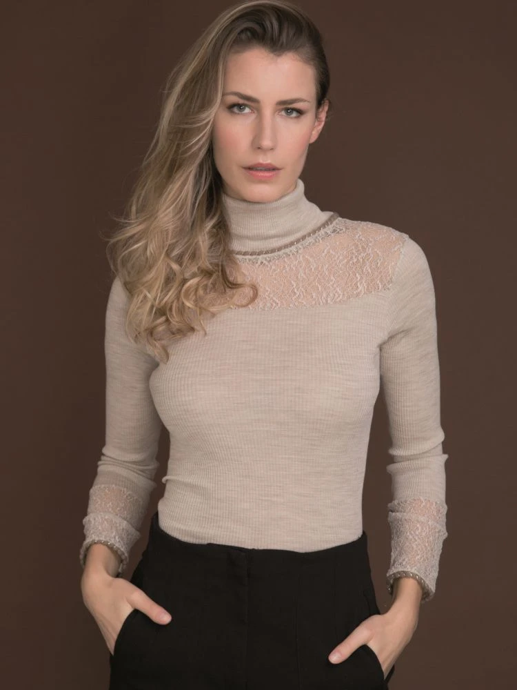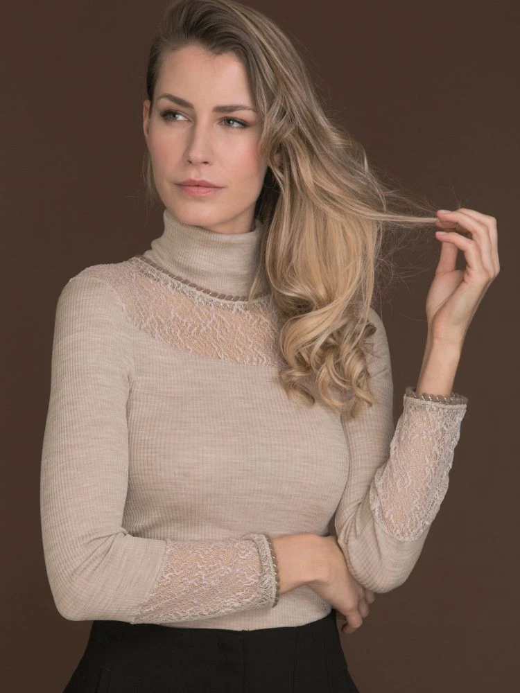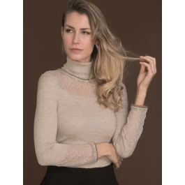 Das Rollkragen Shirt Wolle-Seide besteht aus einem besonders hochwertigen, geripptem Jersey aus 70% extrafeiner Merinowolle und 30% Seide in Kombination mit einer feinen Netzspitze. Dieses edle Rollkragenshirt hat lange Ärmel, eine Gesamtlänge von ca. 60 cm und einen Rollkragen. Das Decolleté ist mit Netz-Spitze gestaltet und das Shirt ist am Hals und den Ärmelenden mit einer dicken Kordel mit Goldglitzer-Details verziert.