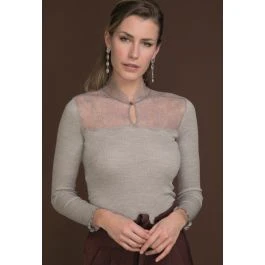 Das Stehkragen Shirt Wolle-Seide besteht aus einem besonders hochwertigen geripptem Jersey aus 70% extrafeiner Merinowolle und 30% Seide in Kombination mit einer exklusiven französischen Caudry Spitze. Dieses edle Shirt hat lange Ärmel, eine Gesamtlänge von ca. 60 cm und einen Stehkragen aus Spitze. Das Decolleté ist ebenfalls mit Blüten-Spitze gestaltet. Der Kragen wird vorne mit einem zierlichen Knöpfchen geschlossen.