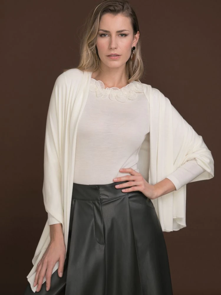 Die elegante Stola Wolle-Seide besteht aus einem besonders hochwertigen Jersey aus 70% extrafeiner Merinowolle und 30% Seide. Dieses elegante, leichte Schal-Tuch hat fein umkettelte Kanten und eine Größe von ca. 75 x 185 cm.