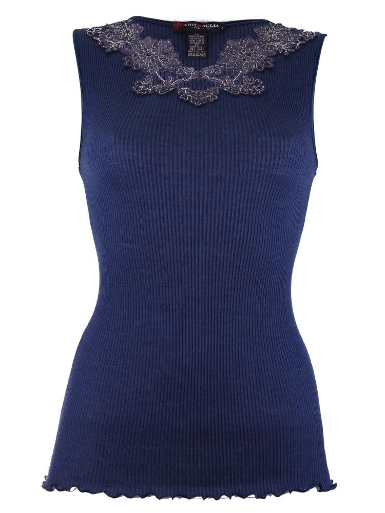 Dieses Top entspricht den Vorgaben des vom italienischen Gesundheitsministerium geförderten Projekts „Textilien und Gesundheit“ und hat die Zertifikatsnummer 14900068. Die eingesetzte hochwertige Spitze hat eine Bestickung in Kontrastfarbe.