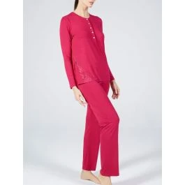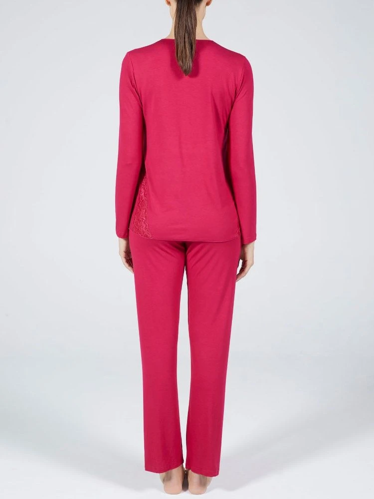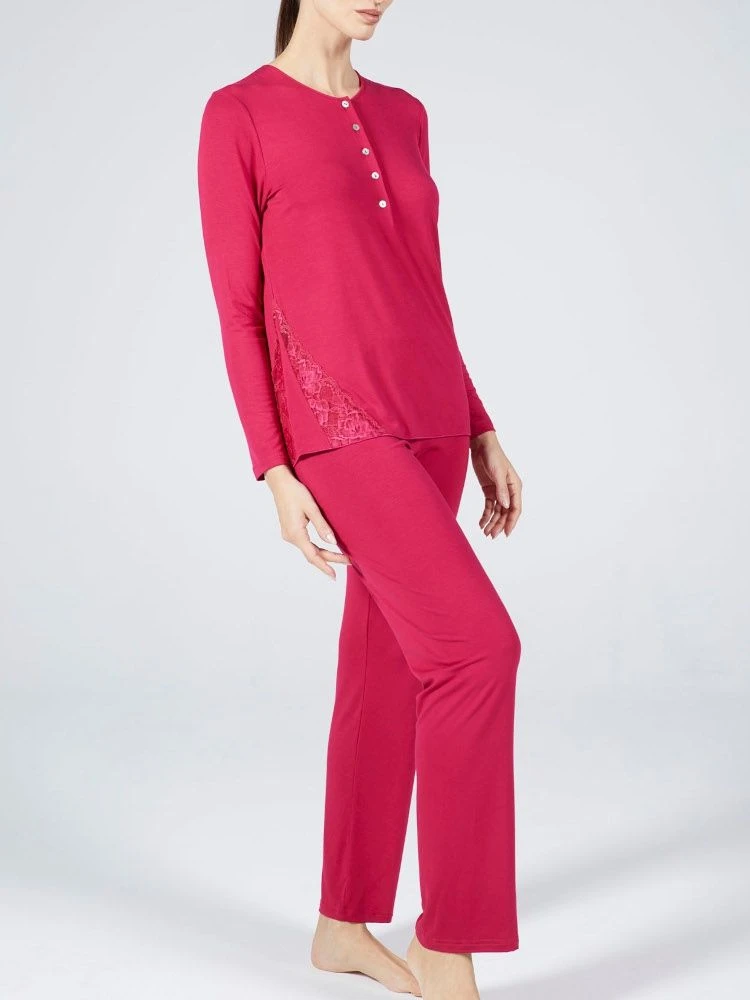 Der lange Pyjama Lampone No. 2 von Verdiani besteht aus weichem Micro-Modal in einer hautsympathischen, elastischen Jersey-Qualität (92% Modal, 8% Elasthan). Er ist Made in Italy und in den Größen 38 bis 46 erhältlich. Der Damen Pyjama hat lange Ärmel und eine kurze Knopfleiste mit Perlmuttknöpfen. Das Oberteil ist seitlich mit Spitze verziert, ca. 65 cm lang und die lange Hose hat einen Gummibund.