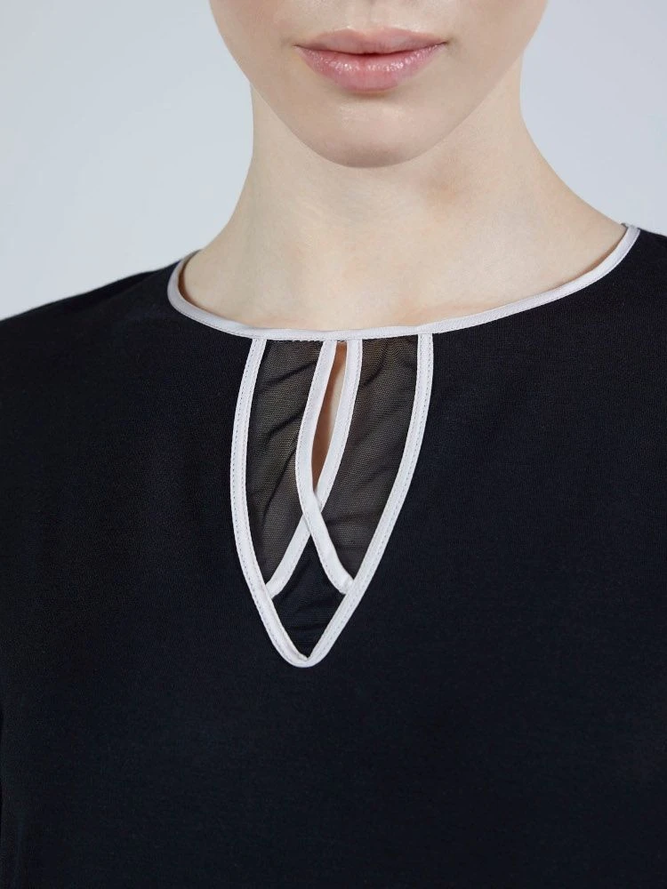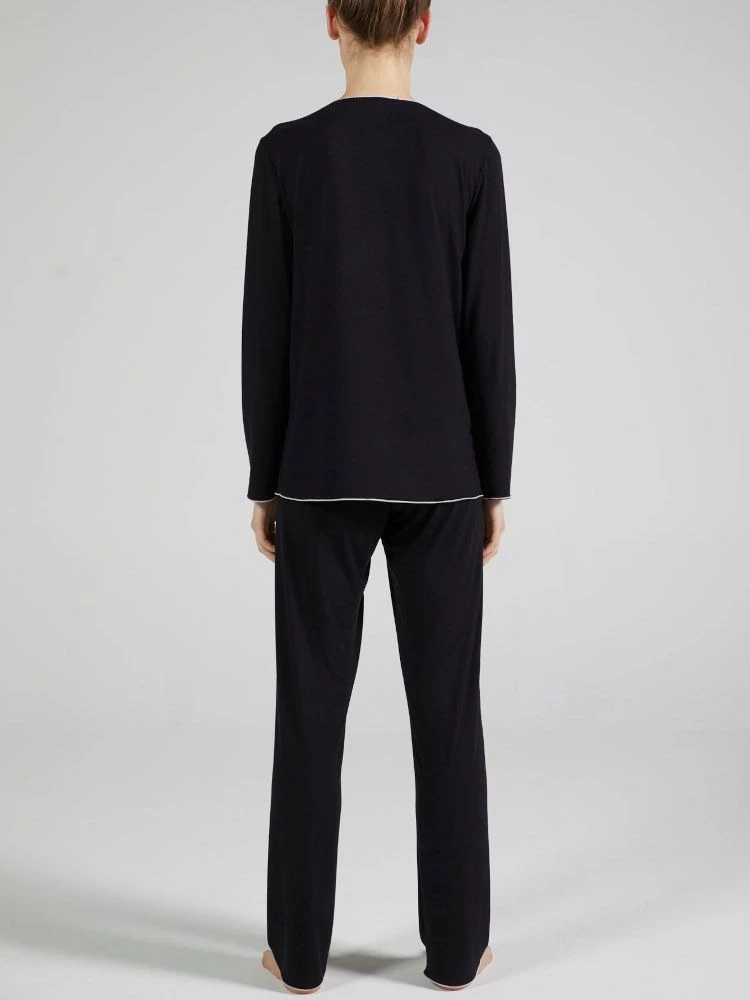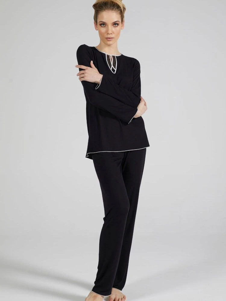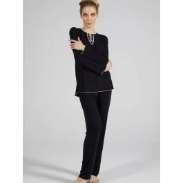 Der lange Pyjama von Verdiani Weekend besteht aus weichem Micro-Modal in einer hautsympathischen, elastischen Jersey-Qualität (92% Modal, 8% Elasthan). Er ist Made in Italy und in den Größen 36 bis 44 erhältlich. Der Damen Pyjama hat lange Ärmel und einen runden Ausschnitt. Der Ausschnitt ist mit puder farbenem Satin eingefasst und hat eine Verzierung aus schwarzem Tüll. Das Oberteil ist ca. 65 cm lang und die lange Hose hat einen Gummibund.
