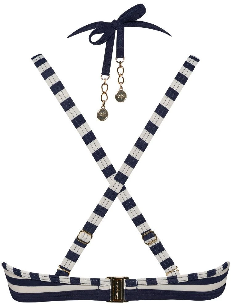 Der Push-Up Bikini Mariniere Maritime Blue B bis C Cup ist eine verführerische Bademode der niederländischen Edel-Dessous Marke Marlies Dekkers. Die Serie Mariniere ist aus dunkelblauem und dunkelblau-creme gestreiftem Feinjersey mit goldenen Schmuckelementen gefertigt.
