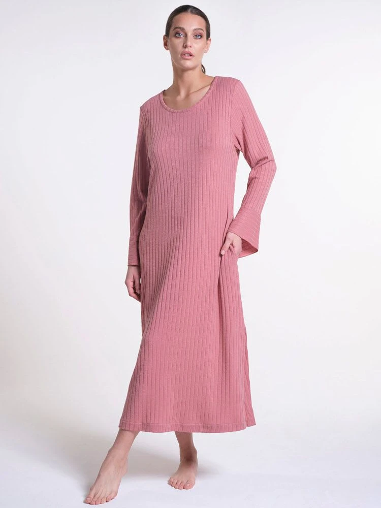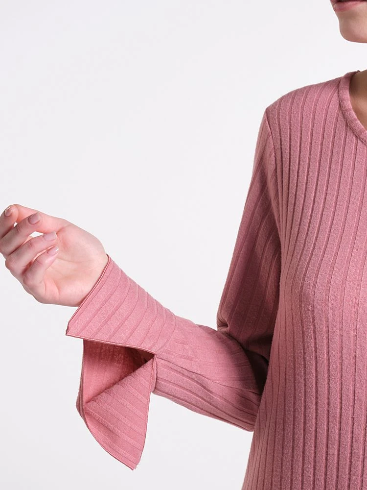 Das Lounge-Kleid hat lange Ärmel, die am Ende weit geschnitten und geschlitzt sind und ist ca. 125 cm lang. Es ist eine bequeme Loungewear für jede Jahreszeit kann aber auch als Tagbekleidung in verschiedenen Kombinationen getragen werden. Da es nicht gefüttert ist, kann es auch als Nachthemd verwendet werden. Das Kleid ist bei uns in der Farbe Phard Altrosé erhältlich.