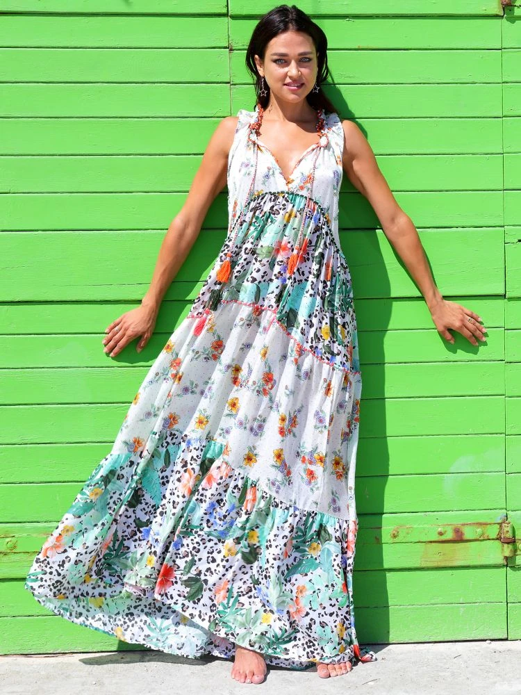 Seidenbatist Strandkleid FANTASIA BIANCO Weiß Grün Von Laetitia Beachwear