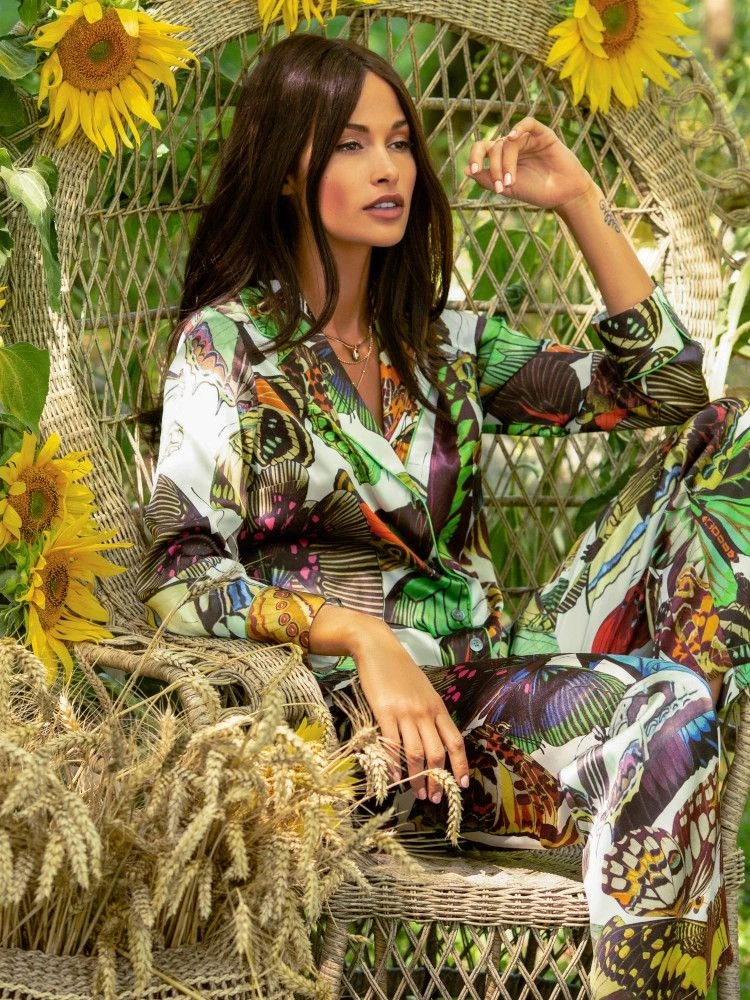 Der lange Seidenpyjama Maya der französischen Luxus-Marke Marjolaine ist aus glänzendem Seidensatin (Stretchseide mit 92% Seide, 8% Elasthan) gefertigt. Das edle Material fällt weich und fließend und ist angenehm auf der Haut. Der Satinstoff glänzt elegant und hat ein modisches Muster von Schmetterlingen auf creme-weißem Grund mit einer grünen Biese.