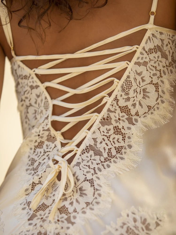 Das Decollete ist aus Spitze gearbeitet – das kurze Neglige ist hier teitransparent. Der breite Saum ist umlaufend aus Spitze und fällt in A-Linie, wodurch das Neglige den Charakter eines Baby-Dolls erhält. Diese kurze Seide Nuisette ist ca. 85 cm lang und hat einen Rücken mit Schnürung. Sie hat verstellbare Spaghetti-Träger.