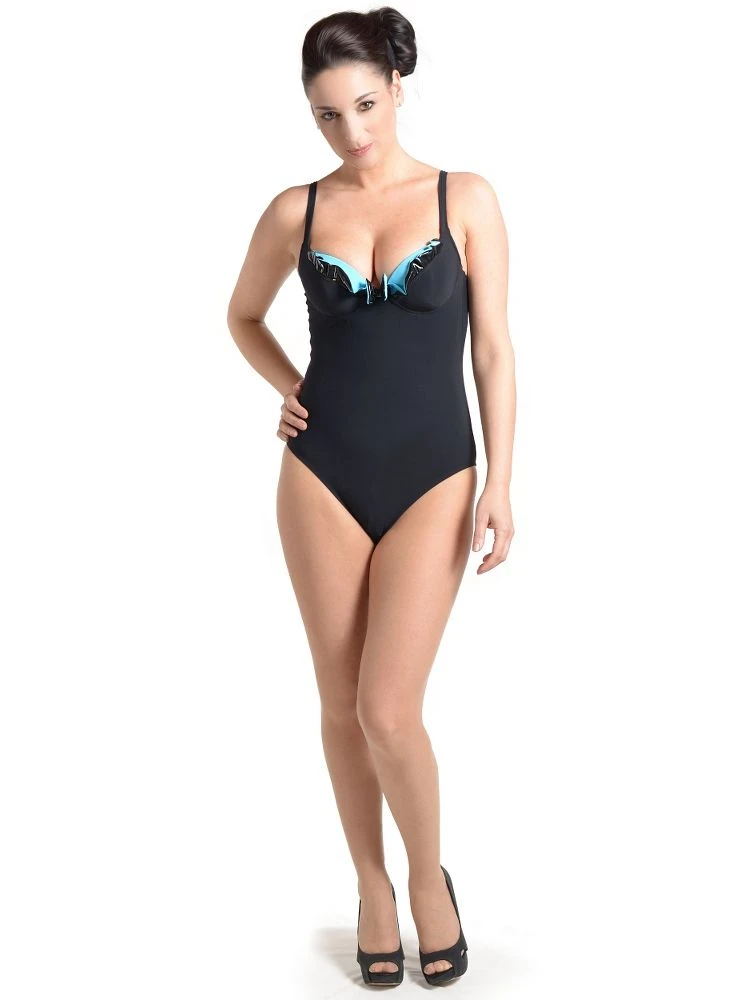 Der Badeanzug ist aus hochwertigem Feinjersey gearbeitet. Im Bereich des Decolletes ist er kontrastierend in leuchtendem türkis abgefüttert und mit Rüschen gestaltet. Außerdem sind hier Details aus Lack-Look Material und eine gefütterte Schleife aufgesetzt, was aus dem ansonsten schlicht schwarzen Badeanzug etwas ganz besonderes macht. Der Badeanzug ist mit B-Cup in den Größen 36 bis 44 (deutsche Damengrößen) in der Farbe schwarz mit türkis erhältlich.